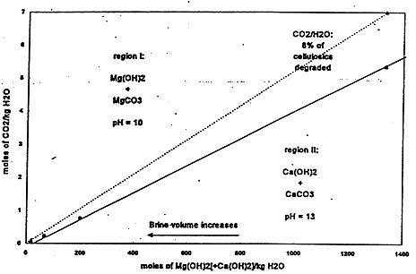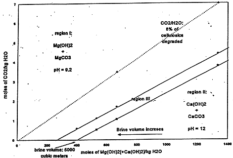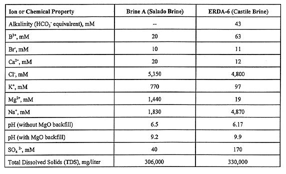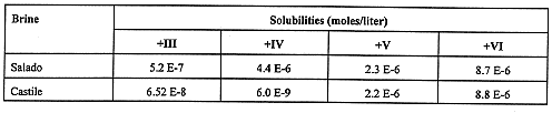 Mobility of radionuclides transported in brine is a function of both solubility and the tendency to form or sorb to colloidal particles. Under possible intrusion scenarios, brines of two different compositions can inundate the repository: the Salado brine, which contains considerable MgCl2, and brine from a reservoir atop the Castile Formation (see Fig. 1): a NaCl brine. Brine compositions are given in Table III (4). Cellulosic materials, plastic, rubber, iron and steel, organic ligands, and, to a small extent, nitrate, can affect actinide solubility in these brines. It is estimated that all cellulosic material in the waste (and about half of the plastics and rubber) can be metabolized to CO2 , methane, and other gases by the action of halophilic bacteria. CO2 is the only one of these gases that can significantly affect actinide solubility. The existence of viable halophilic bacteria in the WIPP after closure is uncertain, so that for modeling purposes such bacteria are assumed to be present half of the time. CO2 is produced only if bacteria are present. The hydrogen produced by anoxic corrosion in the absence of bacteria has no detectable impact on solubility.