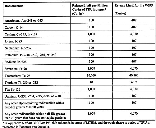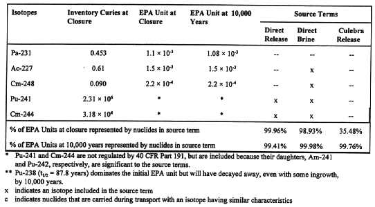 In sum, the radioisotopes that may influence repository performance are Pu-239, Pu-240, Pu-242, Am-241, U-233, U-234, Th-229, and Th-230; for potential releases in the first few hundred years of the regulatory period, Pu-238 , Sr-90, and Cs-137 are included in the calculation (Table II). When potential releases are modeled, however, the only radioisotopes that appear to be significant are Pu-239 and Pu-240 throughout the regulatory period, and Pu-238 and Am-241, during the first thousand years after closure.