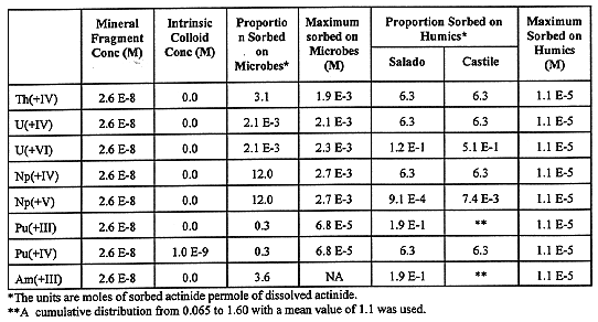 Actinides can also be mobilized in colloidal form as intrinsic colloids, or sorbed on nonradioactive colloidal particles in the waste. Plutonium in the waste can form an intrinsic colloid, and the microbial breakdown products of cellulosic materials, plastic, and rubber can contribute to the quantity of humic colloids. Within the repository, mineral fragment colloids could form from corrosion of iron-bearing waste, the steel packaging materials, and portland cement-based matrices, but are expected to be kinetically destabilized in the high-ionic strength brines present in the disposal room, and their contribution to actinide mobility is negligible. Humic colloids will be present in the repository, both in soil and as cellulose breakdown products. Cellulose, plastic, and rubber in the waste, as well as nitrate, are microbe nutrients, and consequently increase the microbe population. Microbial and humic colloids can transport concentrations of actinides that are several multiples of the dissolved concentration, and thus increase the potential for actinide mobility considerably. Table V gives these proportions.