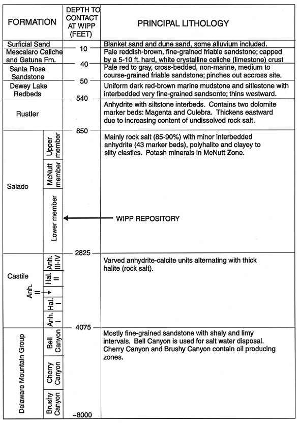 The 1992 WIPP Land Withdrawal Act reserved a 4 mile by 4 mile (6.4 km x 6.4 km) square of federal land, for the WIPP project (5). At the surface, the WIPP site is covered with blanket sand and stabilized sand dunes with poorly developed drainage pattern and desert bushes. Figure 1 shows a geologic cross-section at the center of the WIPP site. The repository is located at a depth of 2150 feet (655 meters) in the lower part of the approximately 2000 ft (610 meter) thick Salado Formation, consisting of bedded salt (halite) and interbeds of anhydrite and clay. The upper part of the Salado Formation contains a 400 ft (122 meter) thick zone rich in potash minerals known as the McNutt Potash Member. The bottom of this zone is approximately 400 ft (122 meters) above the WIPP repository. A 310 ft (95 meter) thick Rustler Formation overlies the Salado and it contains two 25 ft (7.6 meter) thick fractured dolomite water-bearing zones, the Magenta and the Culebra. The more permeable Culebra is considered to be a potential pathway for migration of radionuclides to the biosphere in case of a breach of the repository. The Culebra aquifer is about 1425 ft (435 meters) above the repository.