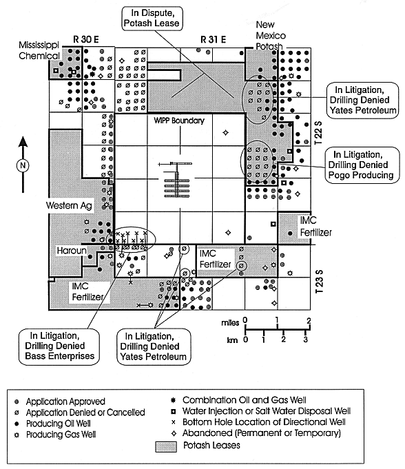 The WIPP site is situated in a region rich in potash and oil and gas. Producing oil and gas wells surround the site (Fig. 2). The nearest production of potash is currently about 7000 ft (2134 meters) from the southwestern corner of the site. Drilling for oil and gas through the potash reserves is restricted until potash mining is completed (Fig. 2).