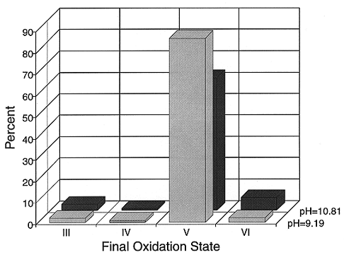 Experiments have been performed to investigate the stability of Pu(VI) in repository condition. Because of the planned addition of 7.8 x 107 kg of MgO as backfill, the repository is assumed to be at pH of 10, and reducing. Reed et al. (13) reported, that for brine at pH of 8 to 10, and reducing conditions, Pu(VI) is stable with an apparent solubility of 10-4 M. Rao (14) reported that in alkaline conditions, it was not possible to reduce Pu(IV) below Pu(V), despite the addition of iron powder. Figure 4 shows the final oxidation state distribution in Rao's experiments. Clark and Tait (15) also concluded that Pu(VI) is stable in WIPP brines. Table III shows the solubility of plutonium in two types of WIPP brines, as calculated using the oxidation-state analogy, and the experimental results of Reed et al. (13).