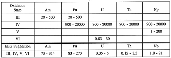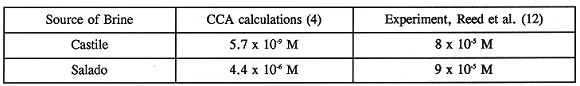 From Table III it is seen that the calculated solubilities used in the CCA are significantly different than experimental results. It is clear that additional justification is needed to explain the compatibility of the oxidation states used for Pu in the WIPP CCA and experimental findings of Reed et al., Rao, and Clark and Tait.