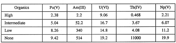 The influence of organics on batch test results is shown in Table II. Even low concentrations of organics dramatically reduced Kd values. The WIPP is expected to have 1.6 x 104 kg of organics. We applied the reduction from no organics to low organics concentration to both the top and bottom range of values, resulting in the suggested values in Table I.