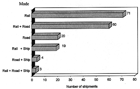 An overview on the number of shipments of radioactive waste from nuclear power plants to waste handling or interim storage facilities is given in Fig. 1. These data were derived for 1992 with a total of 177 shipments. The shown mode depending distribution is supposed to be representative also for the following years. Railway shipment is the dominant mode of transport. Almost 90 % of all shipments include railway.