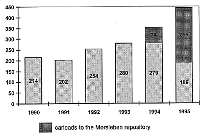 Data for waste shipments of the German Railway Company between 1990 and 1995 are shown in Fig. 2. There is a slight increase of the total carload numbers per year up to 1993. The strong increase in 1994 and 1995 reflects the fact that the Morsleben repository was put in operation again in January 1994 (see next section). The resulting waste shipments to the repository are also included in the total carload numbers per year. If these are eliminated, as shown in Fig. 2, the remaining carload number for shipments of radioactive waste from nuclear power plants to waste handling or interim storage facilities decreases considerably to 189 in 1995. Such shipments are reduced by increasing the number of shipments to the repository.