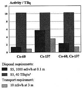 The permissible activity inventory of the waste package is determined by the most restrictive limit resulting from disposal and transport requirements. For transport these limits have to be derived from the requirements for specific activity, unshielded dose rate at 3 m distance and total activity per conveyance depending on the radionuclide mixture, the material, and the volume of the waste.