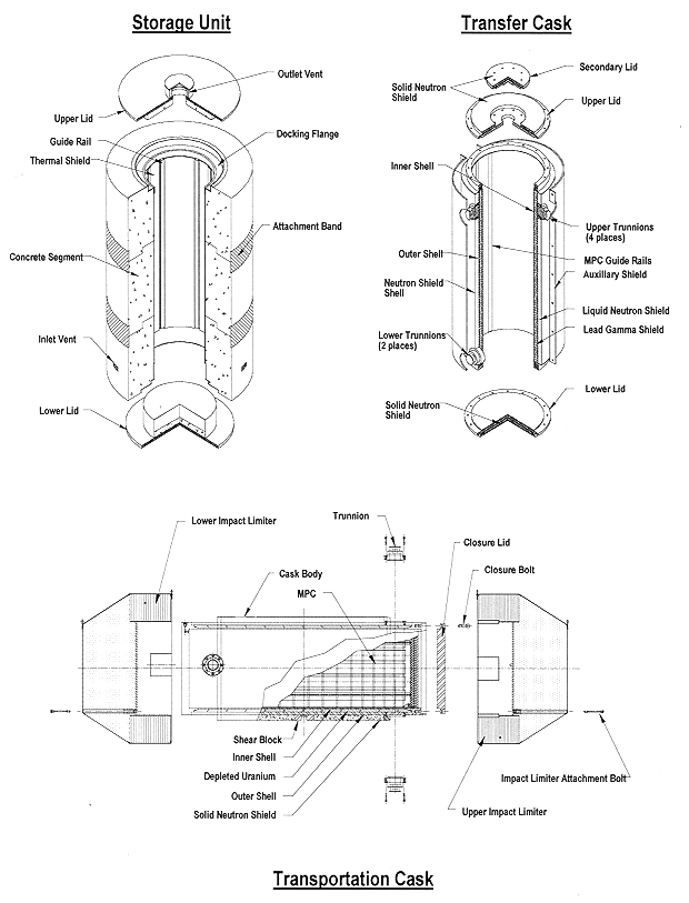 Fig. 1. Storage Unit, Transfer Cask, and Transportation Cask for Handling, Storage, and Transportation of Spent Fuel in MPC Assemblies