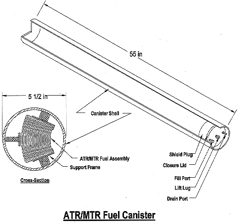 Structural. The ATR fuel assemblies are to be contained in the fuel canisters as shown in Figure 2. The design weight of a loaded fuel canister is 72 lbs, making the total payload weight 9504 lbs. This is significantly less than the maximum commercial SNF payload of nearly 31,000 lbs. Although the payload weight is much less than the commercial application, the impact loads can be higher than previously calculated. Because the impact limiters are designed for the heavier commercial SNF payload, this lighter load produces a smaller crush distance, resulting in a more rapid deceleration and higher impact loads. Calculations have been performed to evaluate the effects of the lighter payload. While the impact acceleration is approximately 10% higher due to the lighter payload, the commercial MPC system has sufficient design margin to handle the minimal impact acceleration increase. The fuel canister wall thickness of 0.19 inches is very robust when compared to the fuel assembly weight of approximately 22 lbs. The horizontal spacer plates of the MPC-44B are a maximum of 6 inches apart, giving 8 or 9 support locations for each fuel canister during a side impact. The end impact produces the maximum axial load where a fuel canister must support two canisters above it. The maximum analyzed wall stresses are well below material allowables and buckling limits. Internal pressures due to the decay heat are also well within canister limits.