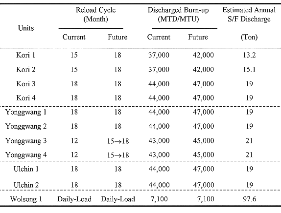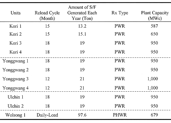 There are two types of power reactors in operation in Korea. The amount of nuclear spent fuels generated in a year is different from reactor to reactor according to the reactor capacity, nuclear type, and fuel loading cycle. Table III shows the fuel load cycle and the amount of spent fuels generated each year for all operating nuclear units in Korea (1).