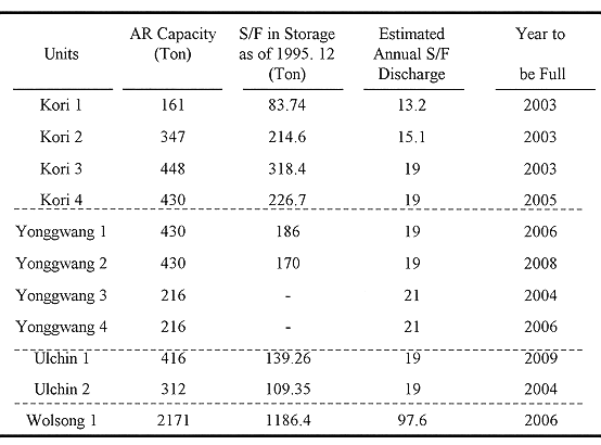 The above table also shows the amount of spent fuel stored in each pool. As shown in the above table, the actual generation of spent fuels had already reached its maximum AR storage capacity for Wolsong nuclear power plant. Therefore, the AR storage capacity of Wolsong unit 1 had been expanded using concrete casks. Other units like Kori unit 1 are also approaching their maximum AR storage capacities. Therefore, the AR spent fuel storage capacities have been expanded or are being expanded through reracking work for the same nuclear units. In the case of Kori unit 3, there is a plan to construct an high density rack facility. For Ulchin unit 1&2 reracking work has already been completed. Therefore, the AR storage capacities are expected to reach their limitations in the year 2003 for Kori site and 2004 for Ulchin unit 2. This will ease the on site spent fuel storage problem for the time being via transhipping of spent fuels from one unit to another in the same nuclear site.
