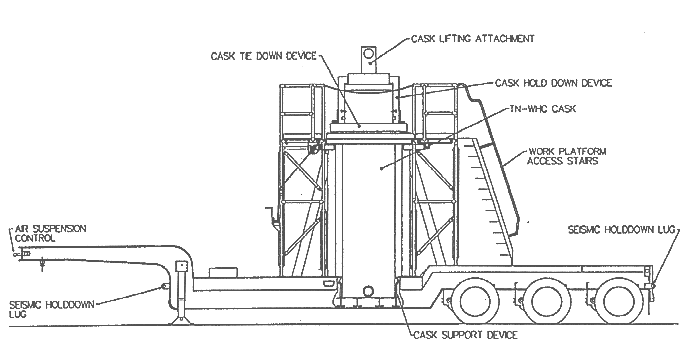 The cask conveyance system is a semi-trailer which can be attached to a standard tractor. The trailer provides the necessary supports and attachment points for securing the cask in the vertical orientation during drying operations and transport. It is designed to minimize the flex due do changes in weight between a loaded and unloaded cask/MCO configuration.