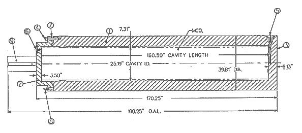 The overall dimensions of the cask are 190.25 inches long and 39.81 inches in diameter. The cask cavity has a length of 160.50 inches and a cavity ID of 25.19 inches. The general arrangement of the cask is depicted in Fig. 2. The cask is designed to allow all operations (i.e. lifting, loading, closure, draining, vacuum drying, transport, and MCO removal at CSB) to be performed in a vertical orientation. The closure lid end is referred to as the top with the cask in the vertical orientation.