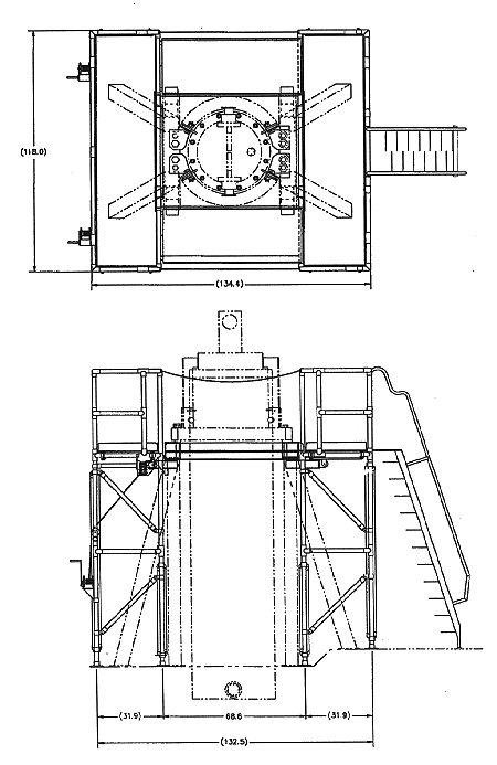The conveyance is designed to transport the cask in the vertical position for operational purposes as mentioned above. The cask rests in a recessed cup set into the trailer bed. The cask is restrained in the vertical position by a tie down system that essentially clamps the cask body and restrains it both horizontally and vertically during transport and also provides seismic restraint at the Cold Vacuum Drying Facility during a seismic event. Layout of the conveyance system cask tie down and work platform arrangement is shown in Fig. 4.