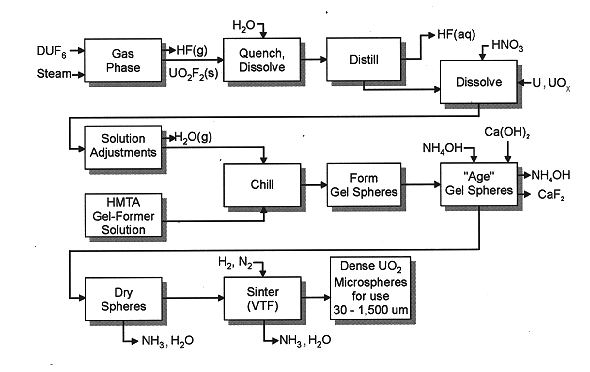 Nitric acid dissolves metallic and oxide forms of DU in reaction kettles, producing uranyl nitrate. Hence, the common stream from the feed area becomes a uranyl nitrate/uranyl fluoride solution. The uranium solution is clarified, and urea is added for uranium stabilization and complexation. The process concentrates and chills this solution, and then combines it with hexamethylenetetramine (HMTA). In chilled solutions, the mixture is stable. However, upon heating, the HMTA partially decomposes and produces ammonia, which precipitates the uranium as ammonium diuranate (ADU). The gelation uses this property to its advantage by dispersing the chilled solution as fine droplets into an immiscible, warm (50-90°C) oil medium. As the droplets fall through the oil bath, they assume the shape of least resistance, namely a sphere. Simultaneously, the ammonia from HMTA decomposition precipitates ADU, which strengthens and hardens the droplet. After aging in the oil bath, the spheres are removed and washed with ammonium hydroxide, which completes the ADU precipitation. Warm nitrogen dries the spheres, producing initial densities of 3-4 g/cc. Sintering occurs in a moving bed within a vertical tube furnace, and results in particle densities exceeding 10 g/cc and bulk densities of around 9 g/cc.