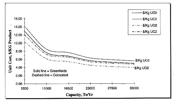 Economic analyses are being conducted over the 5,000-35,000 tonne/yr capacity range. Figure 4 presents the results. The unit cost is very reasonable over the entire capacity range as compared to current, fuel pelletization routes. However, the unit cost increases rapidly below a 10,000 tonne/yr capacity, and, thus, large plants are clearly favored. Above a capacity of 20,000 tonnes/yr, the slope, and, hence, the unit cost reductions, become marginal. A 10,000 tonne/yr capacity approximately equals a 50 year operating period for the current DU inventory in the United States. The two inflection points arise from step function changes in several of the cost contributors. Overall, unit costs are in the $5-6/kg bracket for dense uranium dioxide with a greenfields plant. This allows the material to be competitively used in radiation shielding, with the price of the shielding paying for the conversion costs. Production of coated uranium carbide approximately increases the unit costs by 12%. Colocation of the plant at an existing, fuel cycle site (such as an enrichment plant) is beneficial, and offers around a 20% savings for the dioxide and a 15% savings for the carbide.