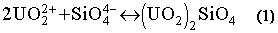 The ionic character of a slag may be represented by its basicity, which is defined as the moles of basic oxide (CaO) divided by the total moles of acidic oxide (SiO2 + Al2O3). The most effective slag basicity was around 1.5. Fluxes containing CaF2 were more effective, possibly because as fluorides break the bonds of the silicate network present in SiO2 containing slags, (14) additional SiO44- anions are produced which could combine with uranyl cations at the slag metal interface, causing uranium capture in the slag according to the following reaction: