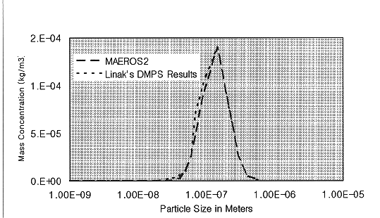 A numerical code, MAEROS2, developed by Gelbard (1993), solves a simplified version of the population balance equation (PBE) which models a multi-component aerosol evolving in time and particle size space. A modified version of the MAEROS2 code (12) predicted well the aerosol evolution in an experimental hazardous waste incinerator (Fig. 3). With modification, this code, interfaced with a code that predicts the species present in the off-gas, could be used to predict the aerosol evolution within the melter and the off-gas treatment system. The code would also be able to handle the changes that occur within the aerosol sample as it is being sampled. Modifications may be required to model the behavior at certain stages of the off-gas treatment system but the basis for the modeling of the fundamental physics appears to be there within the code. The code can currently handle homogeneous nucleation, condensation, and coagulation. When certain stages of the off-gas treatment system is reached, for example, scubbers, additional physics (i.e., due to the effects of water jets) may be required.