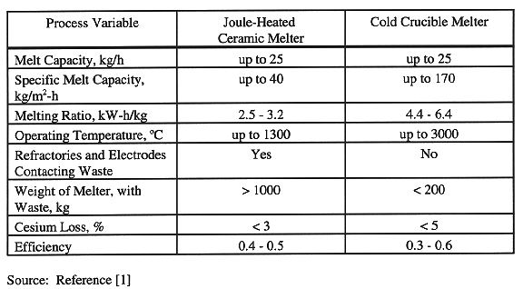 Table I compares process variables for RADON's Joule-heated ceramic melters and cold crucible melters. Note that the melt capacity for the cold crucible system, 25 kg/h, represents a single crucible. For a system with four units, waste throughputs of 100 kg/h could be achieved. As seen in Table I, the compact crucible delivers a much greater melt capacity per unit surface area of the melter.