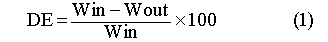 where, Win is the total mass of contaminant in the test chamber and Wout is the amount of contaminant measured in the off gas (40 CFR 1991). The destruction efficiency and the destruction and removal (via off-gas treatment) efficiency (DRE) have historically been based upon the regulations developed for incineration technology, where the quantity of contaminant present initially is known and the amount exiting the stack is measured and everything else is assumed to have been destroyed. This standard approach has been adopted since: ISV is a relatively new and innovative technology and no regulatory guidance has been issued for its operation, with the exception of treating PCBs for which Geosafe was recently granted a national TSCA permit, and the surrounding soils are routinely below or near the detection limit of the analytical procedure. This general approach of analyzing the efficiency of the ISV process has been used in all tests performed by Geosafe and reviewed routinely by EPA and other state and federal agencies.