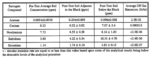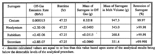 Table II presented the results of the radionuclide surrogate off-gas sampling. Three of the four radionuclide surrogates were below the detection limit when the particulate filter and the impinger solutions were analyzed. In these cases, the detection limit was used to calculate a less than" emission rate. Cesium was found in the off-gas stream at a concentration slightly above the detection limit. It should be noted that sampling of the off-gas stream occurred prior to any off-gas treatment. Cesium was initially present in the highest concentration in the test pit at nearly 300% of the other surrogates. Cesium is also one of the most volatile compounds of the radionuclide surrogates, thus it is not surprising that small quantities will volatilize and be collected in the off-gas system. The emission rate measured for cesium is very low and would easily be handled via conventional off-gas treatment currently being used by Geosafe (i.e., pre-filtering, wet scrubbing, and HEAP filtration). A recent large-scale test completed on a radioactive ORNL seepage pit demonstrated that only 0.0019% of the cesium present in the trench was released to the off gas (99.998% was retained in the melt). This was effectively removed via roughing and HEAP filtration (ORNL/ER-377).