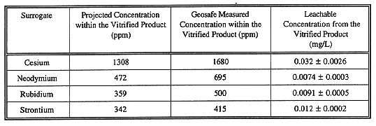 Four samples of the vitrified product were collected and extracted per 40 CFR 261, Appendix II (TCLP) procedure and analyzed for the radionuclide surrogates. The results of these analyses are presented in Table III. Only very small amounts of the radionuclide surrogates were leachable from the vitrified product ranging from 0.0074±0.0003 mg/L for Nd to 0.032 mg/L for Cs. To determine whether these levels are a concern, representatives of the State of New York Department of Environmental Conservation (NYDEC) were contacted. Based upon this conversation, there does not appear to be an approved clean-up standard for radionuclides in the soil at the BNL site. A policy has been proposed that would limit the dose rate in the soil to less than 10 mrem/yr, but has not yet been accepted.