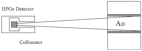 The following is the basic principle of segmented gamma scanning method. HPGe detector is shielded to decrease the background radiation and the shielding material is available as the collimator, as shown in Fig. 1. Therefore, radiation from the waste drum enters into the HPGe detector as cone type. We can easily calculate count rate for radiation entering the HPGe detector from radioactive material through the following equation.