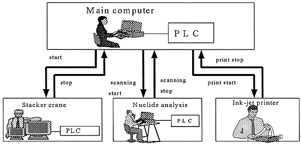 The radwaste assay system is composed of a gamma spectroscopy system, an automatic drum transfer system(stacker crane), a ink-jet labeling system and a drum rotating device. These systems are connected to a main computer for the remote control. The simplified processing is shown in the following Fig. 2