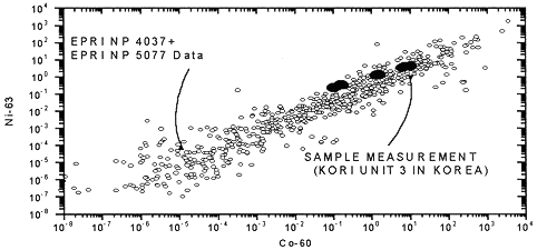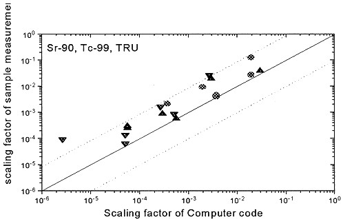 The validation of the scaling factors for the fission products, Tramp uranium nuclides, was to compare them against realistic sample measurements made in operating plant. The scaling factor generated by the computer code using reactor coolant isotopic concentration data obtained during the test period were plotted against the scaling factors derived from the korea atomic energy research institute measurement. The Fig. 4 shows the comparisons for the Sr-90, Tc-99 and TRU. The plots also shows the plus and minus factor 10 boundary lines established for acceptance within NRC guidance (3) and a relatively random dispersion of the computer code results around the line that indicates a perfect fit with measured values. The comparison between the computer code results and the korea atomic energy research institute measurement were quite good in the plus and minus factor 10 boundary lines.