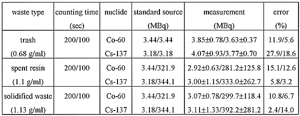 -emitters(Cs-137, Co-60) which are mixed with several materials in the drum were measured by this system. Then appropriate scaling factors were used to assay the activities of nuclides which could not be directly analyzed by this system. The scaling factors were determined by a computer program developed in Korea. The validity of the scaling factor was checked through comparison with several experimental results of local samples taken from real waste streams. Demonstration drums with similar geometries to real waste drums were used for proving the reliability of Ci content determination in this system. It was performed by putting the standard sources(Co-60, Cs-137) into demonstration drums. In the results, the measurement errors were less than 30% in the various demonstration drums. Therefore, measurements of real radioactive waste drums gave us good results for the homogeneous and non- homogeneous wastes generated at Kori(the name of a place in Korea) nuclear power plant in Korea.