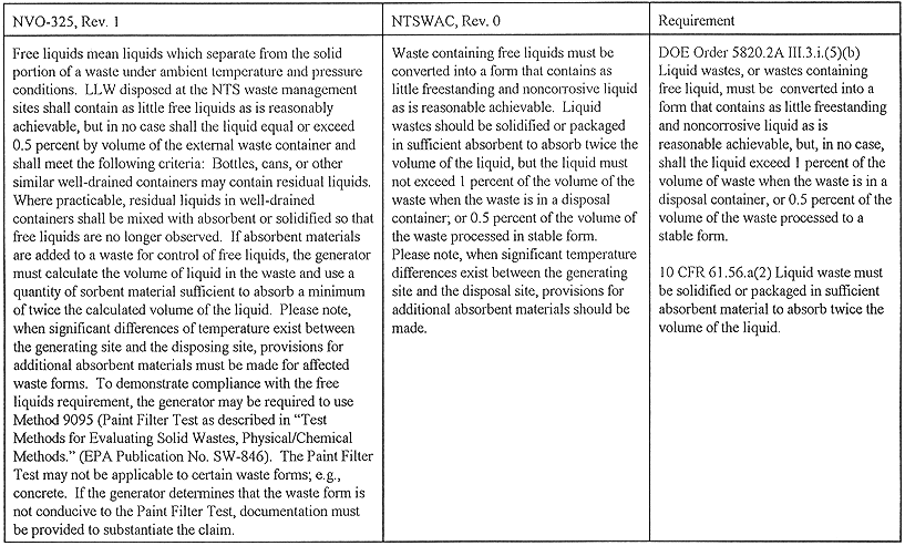 The Free Liquid requirement was changed to reflect the DOE Order 5820.2A requirement. Previous WACs went into great detail on the manner in which this requirement could be met. The change to the simpler language of the DOE Order makes the requirement easily understood and deletes confusing examples (see Table I).