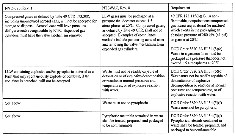 The Gases requirement was simplified to the DOE Order language. Previous WACs added requirements for punctured aerosol cans to be recognizable by Real-Time-Radiography and expended gas cylinders to have the valve mechanism removed. These requirements were changed to examples of how the gas requirement may be met (See Table I).