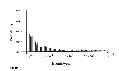 Frequency assessment. For the frequency assessment, an empirical model developed by H.M.Thomas (3) was used. Thomas used a large data base of industry experience to develop his model for use by the nuclear industry to predict piping and vessel failures resulting from internal mechanisms. The modelwhich uses information on component size, shape, thickness, and construction details (such as the number of welds)yields a predicted failure frequency for a typical section of embedded piping. The Thomas model has been used by the chemical industry as well as by U.S. and foreign commercial nuclear power industries.