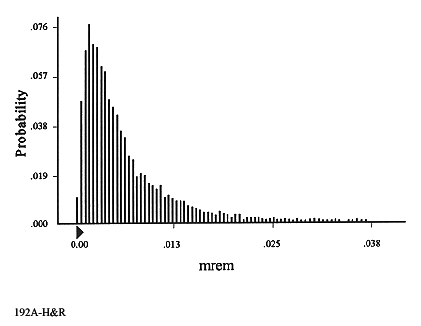 Exposure Assessment: the Public. Potential exposure of the public is presented as a distribution in Fig. 2. The only pathway of significance is the drinking water route. Distributions of the leak size, concentration reduction factor, flow rate of the river, and potential concentrations of radioisotopes in the storage tanks were the assumptions used in the simulation to generate the distribution of postulated doses. The forecasted values of postulated doses to the public from a leak range from 9 (breve) 10-5 mrem effective dose equivalent (EDE) to 0.34 mrem EDE, with a median value of 9.6(breve)10-3 mrem EDE. The allowable dose through drinking water, as established by EPA in the Safe Drinking Water Act, is 4 mrem/year EDE.