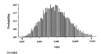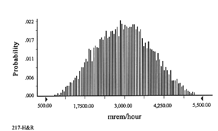 A distribution was also calculated for a cumulative project dose and expected cancer fatalities for the project to replace the embedded piping associated with the storage tanks. The cumulative dose was calculated by using the dose rate distribution for the liquid concentrate in the tanks. The length of time that workers would be exposed to sludges during the replacement project was not projected to be significant. Distributions of the expected cumulative dose are shown in Fig. 4. The range of cumulative dose is 2300 rem to 18,000rem, with a median of 8800 rem.