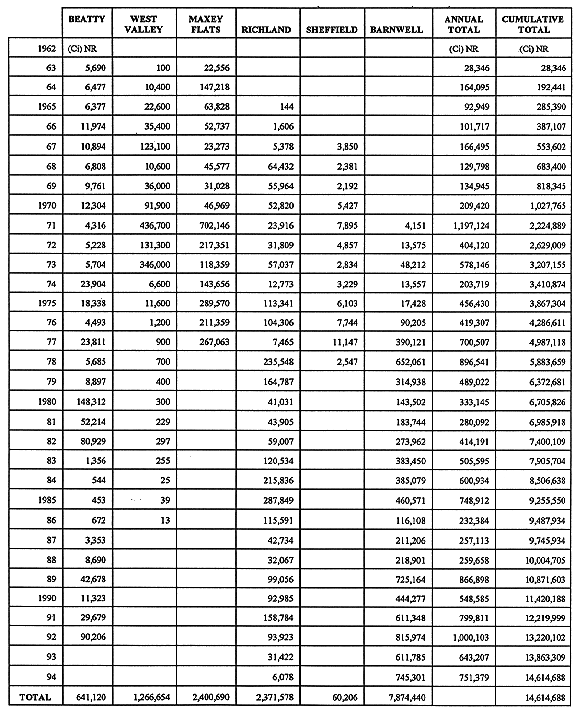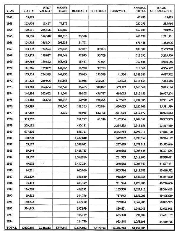 It was hoped that an examination of the volumes of low-level waste disposed of by the fifteen DOE facilities (Table III) would show a similar pattern of decline in waste volume from 1976 to 1994 to that illustrated in the volumes in the commercial repositories. It does not. Peak annual accumulations primarily occur in 1982 and the period between 1984 and 1988. Peak annual accumulation occurred in 1987 with 154,000 cubic meters (5,437,740 cubic feet) being disposed of. The data does however reveal that the major DOE low-level waste disposal sites are the Savannah River Site (676,400 cubic meters = 23,883,684 cubic feet), Hanford (615,300 cubic meters = 21,726,243 cubic feet), and the Nevada Test Site (481,300 cubic meters = 16,994,703 cubic feet).