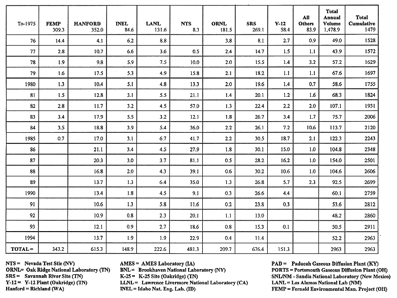 Comparative cumulative volumetric quantities in thousands of cubic meters of disposed low-level waste are available for DOE sites from 1976 through 1994 (Table III). (3) These data, given in cubic meter volumes, are accumulated for this table from the following DOE sites: Fernald Environmental Management Project, Ohio (FEMP), 343.2, Hanford Site, Washington (Hanford) 615.3, Idaho National Engineering Laboratory, Idaho (INEL) 148.9, Los Alamos National Laboratory, New Mexico (LANL) 222.6, Nevada Test Site (NTS) 481.3, Oak Ridge National Laboratory, Tennessee (ORNL) 209.7, Savannah River Site, Tennessee (SRS) 676.4, Y-12 - Oak Ridge, Tennessee (Y-12) 151.3, all others 114.2. All others data includes the total volume from the following DOE sites: Ames [Iowa State Laboratory], Iowa (Ames), Brookhaven National Laboratory, New York (BNL), K-25 Oak Ridge, Tennessee (K-25), Lawrence Livermore National Laboratory, California (LLNL), Paducah Gaseous Diffusion Plant, Kentucky (PAD), PANTEX Plant, Amarillo, Texas (PANT), and Portsmouth Gaseous Diffusion Plant, Ohio (PORTS), and Sandia National Laboratory, New Mexico (SNL/NM). The total cumulative volume for all these DOE sites is 2,963,000 cubic meters or 104,623,530 cubic feet. (3) Up-to-date data concerning the radiometric content of this waste in curies are not readily available.
