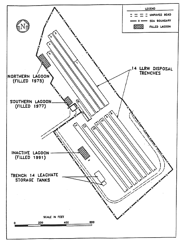 From 1963 to 1975, Nuclear Fuel Services (NFS) operated the SDA as a disposal site for low-level radioactive waste. Approximately 6.65x104 cubic meters of packaged waste were disposed of in two sets of parallel trenches referred to as the North and South areas. Each area contained seven trenches and were numbered 1 through 7, and 8 through 14, respectively (Fig. 1). Typically, trenches were 170-meters long, 6-meters deep, and varied in width from 6 meters at the bottom to 11 meters at the top, except for two specially constructed trenches (Trenches 6 and 7). Wastes placed in the trenches were then covered with soil that was excavated during trench construction.