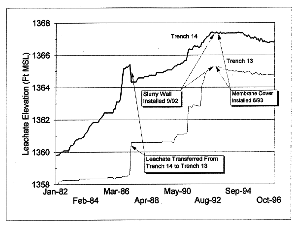 Following this work, Trench 14 water levels rose at a much slower, but steady rate until sudden increases in the Trench 14 leachate level occurred as a result of heavy rainfall and snowmelt in late 1990 and early 1991. This was followed by a dramatic rise in the Trench 13 leachate level providing evidence of the suspected hydraulic interconnection through a sand and gravel body between Trenches 13 and 14 (Fig. 2).
