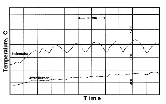 A typical temperature profile of incinerator operated at 900°C is shown in Fig. 2. This figure also shows that of an afterburning chamber when the afterburner did not operate. According to schedule to evaluate the effect of afterburner on the incineration performance, the first trial burn was carried out without operation of afterburner. However, only total 180 liters of RI waste could be incinerated in this work because the melted waste put into a space between the ash-withdrawal door and the incinerator bottom, which finally made the ash-withdrawal door not-operated. The ash-withdrawal door system is a hatch type which was originally designed to give the effectiveness in sealing and ash-removal when burning the NPP's wastes, composed mainly of paper, textile cloths, or shoes (7). To solve this problem, new burner for the melted waste on the bottom has been added close by the incinerator bottom.