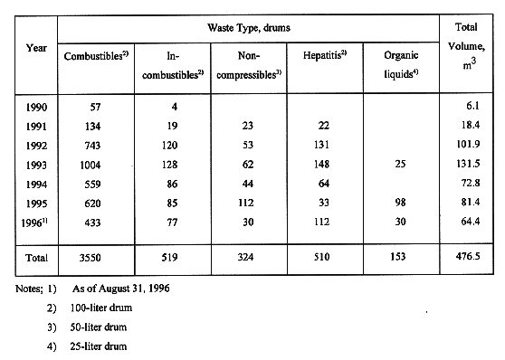RI wastes are categorized, depending on their characteristics, as combustibles, incombustibles, noncompressibles, hepatitis, organic liquids, animal carcasses, sealed sources, or spent filters, as listed in Table I. Animal carcasses have not been collected yet because of rotting in transportation and storage. Organic liquids and sealed sources are packed in stainless steel 25 liter drums. Noncompressible wastes and the other wastes are packed in carbon steel drum of 50 liters and 100 liters, respectively. A total of 5,056 drums, equivalent to 476.5 cubic meters, except for animal carcass, sealed source and spent filter, were stored in an interim-storage building of KAERI, as of August 31, 1996, and summarized in TABLE II.