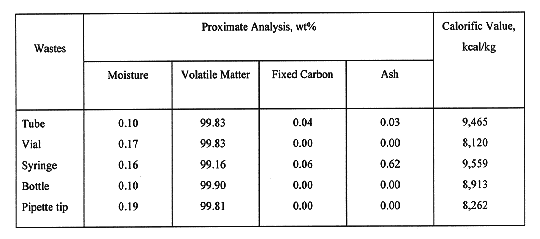 The combustible wastes burned in this work were sampled from the extremely low level RI wastes that had passed more than 2 years since their generation. The radioactive nuclides in the RI waste were iodine-125 (of about 70%), technetium-99m (of about 10%); phosphorous-32, tritium or carbon-14, and the total activity was lower than 100 Bq/g. Their physical types were tubes, syringes, vials, bottles, and pipette tips. The results of the proximate analysis and the calorific values are shown in Table III. Most RI wastes were composed of volatile materials with little ash (less than 1%), and an average calorific value of them is about 37,000 kJ/kg (8,900 kcal/kg).