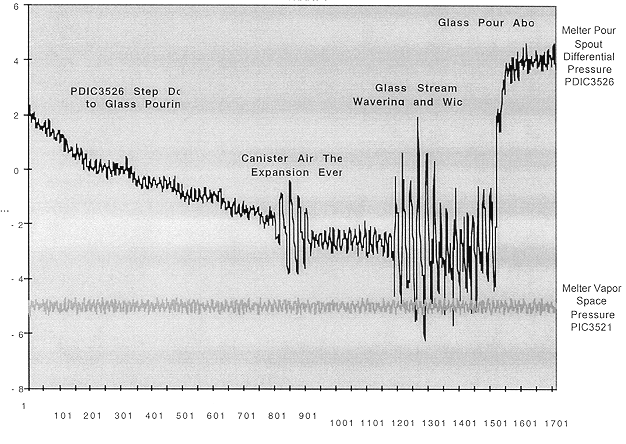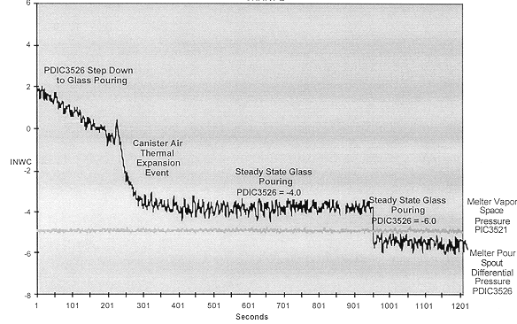 This chart signifies a successful pour attempt in which no glass stream wavering and/or wicking was observed during the pouring of glass. The differential pour spout pressure was stepped down to its normal operating value (-6 INWC) and a steady state pour was observed. None of the pressure perturbations, transients, and/or cycling experienced during the aborted pour was observed. This specific pour continued until Canister S00317 was filled.