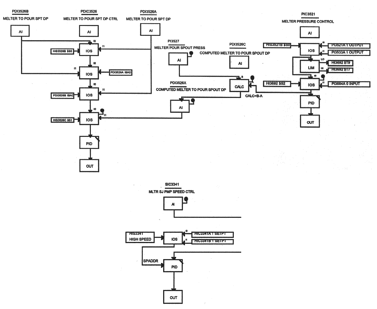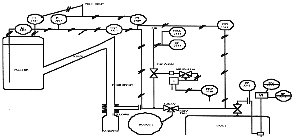 Melter pouring is primarily controlled through pressure controllers PIC3521 (Melter Vapor Space Pressure Controller) and PDIC3526 (Melter Pour Spout to Vapor Space DP Controller). The Spout Jet pump is a standard eductor unit operation and is the device used to generate the vacuum on the pour spout section of the Melter. The Spout Jet Pump, HIS3341 has a speed controller tied to it labeled SIC3341 and runs at either low speed or high speed in which high speed is used during pouring.