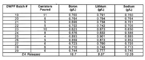These eleven batches have resulted in the production of 78 canisters. The number of canisters poured in each process batch as well as the durability model projected PCT results for each process batch are given in Table II. Additionally, the published EA glass release results are given for comparison purposes. As shown in Table II, the projected PCT results for all 11 SME batches were far below the leachate values for the EA glass. Based on these results, the glass producedfrom Tank 51 sludge and Frit 200 is significantly more durable than EA glass and is therefore acceptable (i.e., WAPS requirement 1.3 was satisfied).