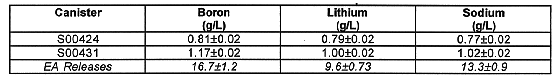 Confirmatory glass samples were taken periodically from the glass pour stream during the first 11 process batches. Every fifth canister up to the 30th canister had a sample taken from the pour stream in addition to the 50th canister and the 61st canister. Currently, only two samples have been transported and analyzed at the Savannah River Technology Center (SRTC): the first canister (S00424) and the tenth canister (S00431). The durability of the two glass samples was measured at SRTC using the PCT. Samples of the ground glass were subjected to the PCT along with the appropriate blanks and standards glass as prescribed by the procedure. The PCT releases for B, Li and Na were measured for canisters S00424 and S00431 and are given in Table III along with the standard deviation obtained in the triplicate tests 8,9. Based on the results of the PCT, canister samples from S00424 and S00431 meet the waste acceptance specification for glass durability.