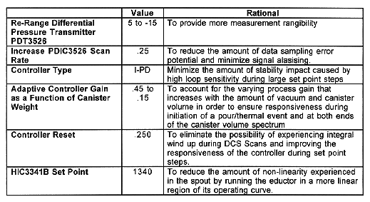 The analysis of the data defined a number of controller and loop modifications which are listed in Table IV. The major changes were to re-range the DP Transmitter (PDT3526), significantly increase the PDIC3526 controller/loop scan rate, and change the controller algorithm type.