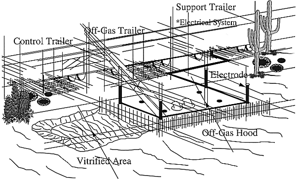 Closure and Monitoring: Quality assurance/quality control (QA/QC) will be performed on site following vitrification. Core sampling around the monoliths will demonstrate that contaminants have been completely stabilized. In addition to backfilling the hole where the vitrified monolith now lies, a flexible membrane barrier will be placed over each site to redirect rain water around the monolith. Backfill will be added to a depth that will be calculated using the same worst-case procedure used in the site preparation overburden calculations (2-9). A layer of topsoil will be added to provide a vegetative cover. All equipment used on-site, including the off-gas treatment equipment, off-gas hood and excavation equipment will be acid washed and wipe sampled to confirm decontamination. Spent scrubber solution, granular carbon, and HEPA filters remaining at the end of the off-gas treatment process will be encapsulated in concrete and shipped to a mixed waste landfill for disposal. Long-term QA/QC will be implemented by taking quarterly soil samples. Research has shown that vitrified monoliths can be expected to last over 1,000,000 years (1).