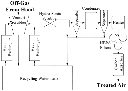 The venturi and hydro-sonic scrubbers remove radionuclides and particulates. Heat exchangers and separators are used to reduce the temperature of the gas and minimize the formation of aerosols. At the end of the process, dual high efficiency particulate air (HEPA) filters provide a factor of safety in removal of particulates and radionuclides, while carbon adsorption is used to remove any remaining organics not thoroughly combusted in the hood (1). Air monitoring will be performed during vitrification according to standard practice (40 CFR Part 60, Appendix A) for dioxins/furans, radionuclides, VOCs and particulates. Dioxins/furans are of concern as they are common hazardous byproducts of combustion. Detection of these compounds below the Applicable or Relevant and Appropriate Requirements (ARARs) will provide evidence of the quality of the combustion process.