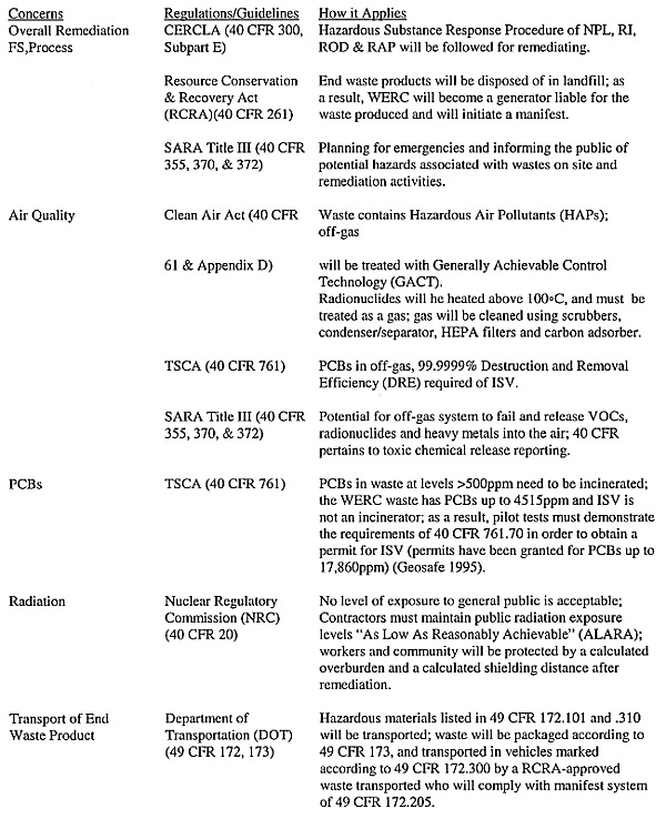 Based on site data provided by WERC, it was assumed by the student design team that the site in question has been placed on the National Priorities List (NPL), and that a Remedial Investigation (RI) has been performed. Thus, the following section has been written as though ISV is being reviewed for a site Feasibility Study (FS). Upon completion of the FS, a recommendation that ISV is the most appropriate remediation technology for the site in question should be submitted to the EPA and NMED. These agencies will review this recommendation, and upon their agreements, a Record of Decision (ROD) will be announced to inform the public of the selected remediation technology, which will be implemented in and documented by the Remedial Action Plan (RAP). Implementation of the RAP includes applying for any and all necessary permits, and complying with all applicable and relevant federal, state, and local standards and guidelines. Physical remediation action will take place upon the approval of the RAP by the EPA and NMED.